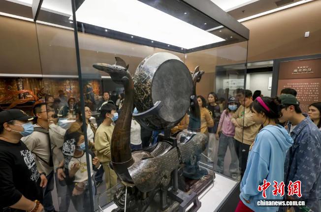 游客在荆州博物馆参观虎座凤鸟悬鼓。大型礼器漆木彩绘虎座凤鸟悬鼓,常与编钟、编磬等组合成“金石之声”,仅出土于楚国贵族墓葬。由立凤、卧虎、悬鼓、长方形器座组成,造型别致优美。(资料图)张梦瑶 摄