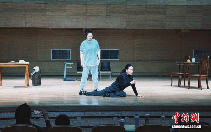 11月21日,雷佳(右)在排练现场指导演员。(受访者供图)