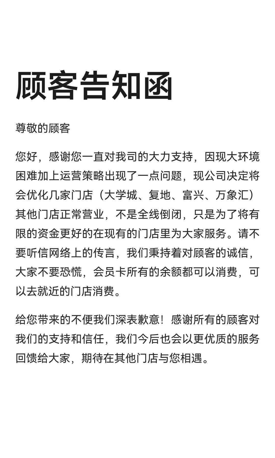 您好,感谢您一直对我司的大力支持,因现大环境困难加上运营策略出现了一点问题,现公司决定将会优化几家门店(大学城、复地、富兴、万象汇)其他门店正常营业,不是全线倒闭,只是为了将有限的资金更好的在现有的门店里为大家服务。请不要听信网络上的传言,我们秉持着对顾客的诚信大家不要恐慌,会员卡所有的余额都可以消费,可以去就近的门店消费。